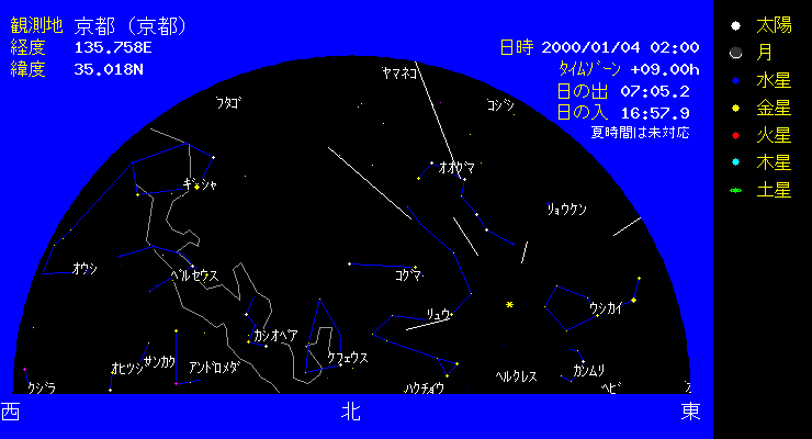 | 1999年も終わろうとしています。年末は2000年問題で、正月休がない方も多いのでは。そんな方も、実家で過ごされる方も、旅行に出かけられる方も、冬の南の空には下のような満天の1等星を見ることができます。冬の南の空には、オリオンや、ふたご、ぎょしゃ、おうし等形のはっきりした星座がたくさんあります。お星様とコンピュータ、お星様iを使って、調べましょう。 |