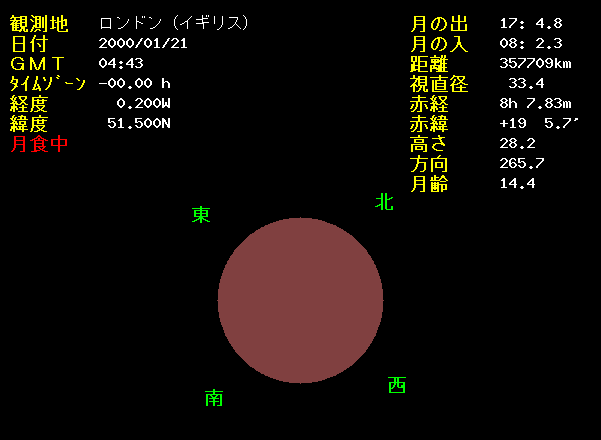 | 1月21日,アメリカ、ヨーロッパ、アフリカで皆既月食がおこります。日本では見ることができません。世界標準時4時43分(日本標準時13時43分)頃、食が最大になります。月食の場合は この時刻に月が見えている地域では、どこでも見ることができます。欠けていく角度が異なるのみです。ある日の月で、時刻を「すべて世界標準時(UT)」にして、観測する地域をいろいろ変えてみましょう。 | |