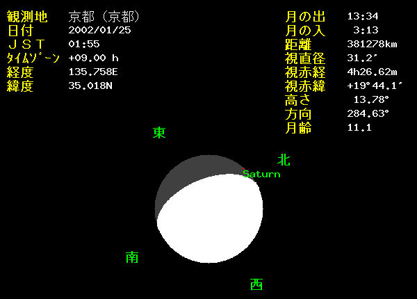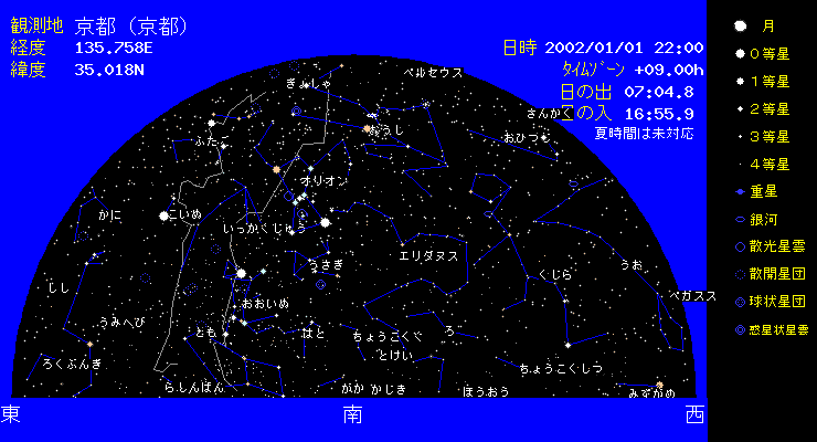 | 寒くなればなるほど星が綺麗に瞬く季節になって来ました。南の空の多くの1等星は、都会でもその美しさがわかります。今年は、木星と土星が加わり更に賑やかさを増しています。またこの惑星のため、冬の大三角形が一見しただけではわかりづらくなっています。 冬の間に、このお星様とコンピュータや、お星様iで星の名前を覚えてくださいね。 1月4日は、りゅう座ι流星群。寒い季節ですがまずまずの出現をみせます。次に1月25日夜中の土星食です。これは千葉県−石川県より南で見られます。2日後の1月27日には、東北以北においては、沈む間際の月に木星が隠されます。  今年は下弦の月があり観測条件があまり良くありません。極大時刻が1月4日3:00であり、流星の輻射点が北極星の位置くらいにはあるので、観測には適しています。この流星群は、極大日に流星のほとんどを散らしてしまうので見逃さないようにしましょう。寒い時期なので完全防備で観測しましょう。流星群のページもどうぞ  この土星食は、千葉県−石川県より南で見られ、これより北の地域では、土星が月をかすめて通ります。あなたの住んでいる地域の土星食はこちら  この木星食は、東北以北で見られます。これより南の地域では、木星が月をかすめて通ります。月没近くの月に木星が隠され、そのまま月が沈みます。あなたの住んでいる地域の木星食はこちら |