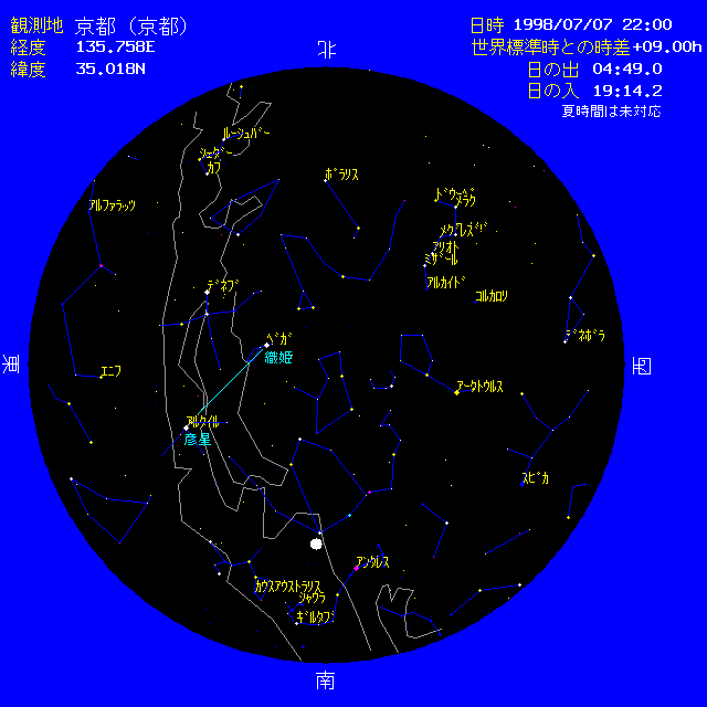 | 梅雨のうっとしい季節です。こんな季節でも、からっと晴れることがあり、その様な時は空気中の 塵が雨で流されているのか、本当に空が澄んでいます。私の住んでいる京都でも天の川が、 かすかにみえることがあります。7月と天の川で思い出すのが、七夕ですね。彦星、織姫の星は 下の星図の通りです。天の川を挟んで二つの星はあります。東に見えるのが彦星(わし座アルタイル) 天頂にみえるのが織姫の星(こと座ベガ)です。今月はこの二つの星を覚えましょう。 | |