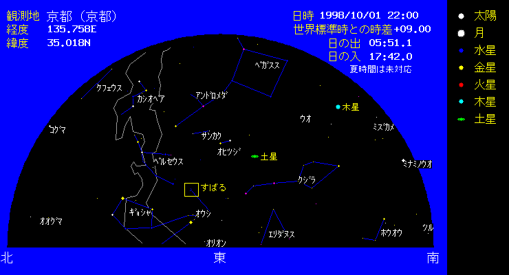 | 今年は台風の多い年です。台風の被害のニュースを見ていると痛ましいものがあります。 雨や曇りの日が多く、なかなかお星様も見えないですね。秋の星座は、明るいものが少ないのですが 今年は、木星と、土星が大変明るく輝いています。南の空に大変明るく輝いているのが 木星です。双眼鏡をお持ちの方は双眼鏡で観測してみましょう。小さな星を4個連れているのが わかります。これが木星のガリレオ衛星です。夜も遅くなってくると、東の空から スバルが昇りはじめます。正式名称はプレアデス星団です。目の悪い人は青白い小さな薄い雲のようで 目のいい人は6個以上の星がみえるでしょう。双眼鏡で見ると、自動車のスバルのマークは この星団がデザインされていることがわかります。 それと、今年の中秋の名月は10月5日です。 |
