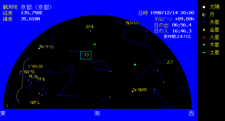 | くじら座のミラが肉眼でも確認できるようになってきています。この星は変光星であり、明るさが周期332日で2.3〜10.1等星 と変化します。 |
