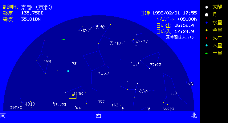 | 大変寒い日が続きますが、冬晴れであればこんな時ほど星の美しい日はありませんね。 冬は南の空に一等星が勢揃いするので、都会にお住まいの方も会社の帰りには多くの 星を見ることができます。お星様とコンピュータで星の名前を覚えましょう。金星が宵の明星となって、西の空に輝き始めました。 また、2月16日にオーストラリア近辺にいらっしゃる方は、日食が観測できます。 残念ながら日本では部分日食も見られません。 |