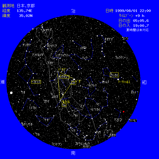 出かけるのはどうでしょうか。 8月頃の天頂には、夏の大三角形と呼ばれている、こと座のベガ、はくちょう座のデネブ、わし座の アルタイルをはっきり見ることができます。この3つの星は都会でも見ることができますので 名前を覚えましょう。うしかい座のアークトゥールスは西の空に沈み始め、東の空には、秋の星座である ペガススの四角形が昇り始めています。 8月11日はヨーロッパからインドを抜ける、皆既日食が見られます。日本では部分日食も 見ることはできません。ヨーロッパに観測に出かけられる方、ヨーロッパにお住まいの方は 日食の状況をレポートいただければ嬉しく思います。ホームページで発表させていただきます。  |