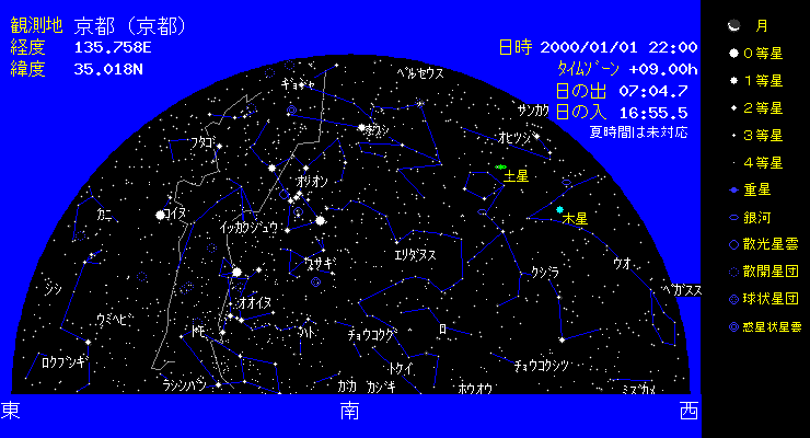 | 1999年も終わろうとしています。年末は2000年問題で、正月休がない方も多いのでは。そんな方も、実家で過ごされる方も、旅行に出かけられる方も、冬の南の空には下のような満天の1等星を見ることができます。冬の南の空には、オリオンや、ふたご、ぎょしゃ、おうし等形のはっきりした星座がたくさんあります。お星様とコンピュータ、お星様iを使って、調べましょう。 |