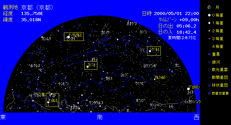 | 今年のゴールデンウイークは5月4日が新月であり、泊りがけで天体観測に出かける方もいらっしゃるのでは。春の明るい星は、そんなに多くありません。うしかい座のアークトウルス、おとめ座のスピカ、しし座のレグルスがポツリと見られます。また望遠鏡をお持ちの方には、かみのけ座の銀河団が南中してきており、楽しみな季節と思います。東の空には、夏の星座であるさそり座のアンタレスが昇り始めています。 |