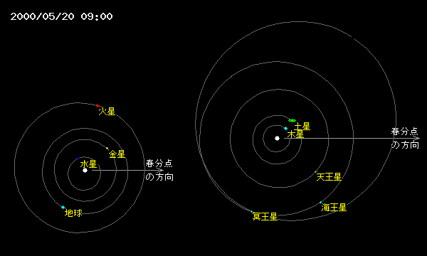 5月20日頃に天王星、海王星、冥王星を除く惑星がほぼ1列に並びます。しかし明るい惑星はすべて太陽の近くに集合しているので見る事ができません。惑星が一列に並んでも9惑星の質量の合計は,太陽の約1/747しかなく何も起こりません。前回の惑星直列は1982年3月10日でした。この時は太陽と反対側で惑星直列がおこったので惑星の集合を見る事ができました。 もっとも水星、金星、火星、木星、土星が狭い範囲に収まるのは5月17日19時30分頃です。この時約19.4°です。 |