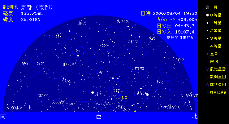 | 水星の東方最大離角は6月9日になります。現在黄道が地平線に対して立っているので、日の入時の高度は約20°となり比較的観測はしやすいのですが、肉眼ではなかなか場所がわからないと見つけるのは困難です。6月4日には細い月のすぐ右側(北側)にいるので探してみましょう。 |