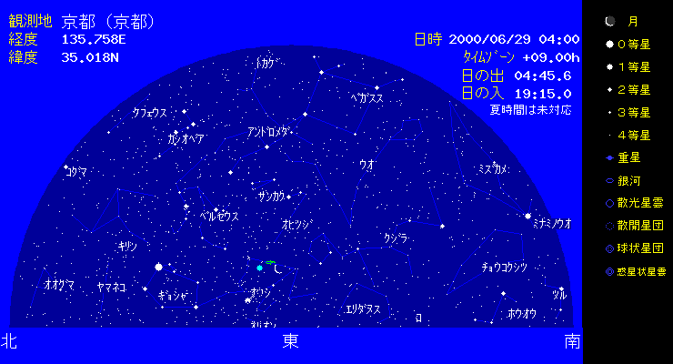 | 6月29日夜明前、土星、木星、細い月が接近します。土星、木星とも太陽の近くにいたので見ることはできませんでしたが、今後観測ができるようになってきます。 |