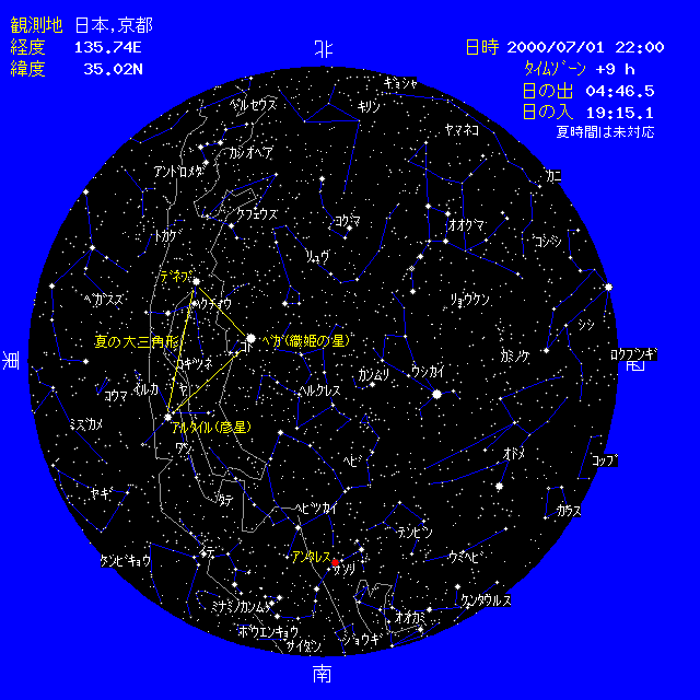 | 梅雨に入り全国的に星の見えない日が続いています。imodeの方の掲示板には、その残念さが書き綴られています。しかし、7月はBigな天文イベントがいくつもあり、このときだけは晴れてもらいたいものです。 7月に入ると夏の大三角形が天頂に上ってきます。わし座のアルタイル、こと座のべガ、はくちょう座のデネブです。アルタイルとべガは天の川を挟んであります。この星はご存知の通り彦星と、織姫の星です。7月7日は七夕ですけど、梅雨の真っ最中でなかなかこの星を見る事ができません。8月の旧暦の七夕の方が星見には適しているでしょう。もう一つの星デネブは白鳥のしっぽです。この白鳥は天の川の上を飛んでいます。 南に目を移すと、赤い(オレンジ色の)星が見られます。さそり座のアンタレスです。さそり座は南の空低くSの字を描いており、形の整った星座の一つです。