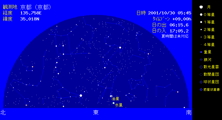 ![]() 10月8日3:20頃から北日本で木星が月に隠される現象「土星食」が起こります。南日本では、土星食にはなりませんが、月に接近する土星の様子を楽しみましょう。月は地球の直径の30倍程しか離れていないので、観測する地域により位置が少し変わります。従って、土星が月に潜入する場所も地域によって変わります。 ![]() 10月30日には水星が西方最大離角となり、明けの東の空の低いところに見られます。水星は太陽に一番近い惑星であり、太陽からあまり離れないので見るのが難しい星です。 |