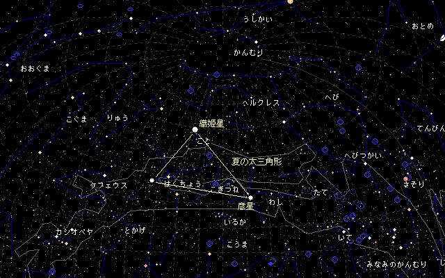 7月7日は、七夕です。天候が心配なのですが、良ければ東の空を眺めてみましょう。1等星で構成される三角形が目につくはずです。その内の天頂に近い一番明るい星が、