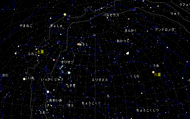 2004年明けましておめでとうございます。初日の出を見に行かれる方も多いのでは。こちらで地域別の初日の出時刻を調べることが出来ます。寒い季節は本当に星が綺麗に瞬いています。南の空の多くの1等星は、都会でもその美しさがわかります。火星と土星が加わり更に賑やかさを増しています。 冬の間に、このお星様とコンピュータや、お星様iで星の名前を覚えてくださいね。冬の大三角形から覚えるのが良いと思います。 南