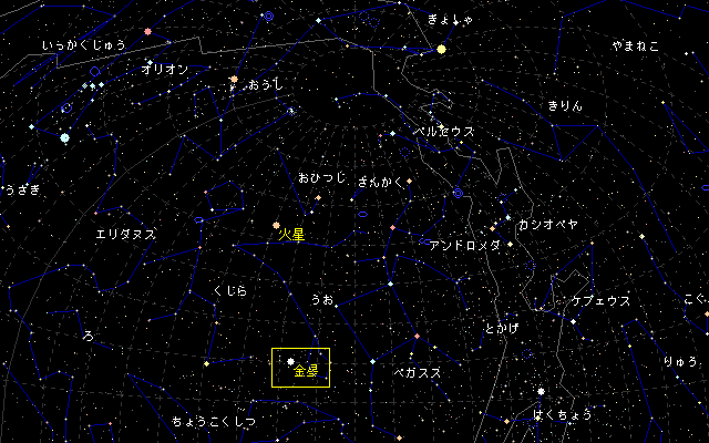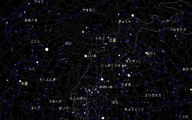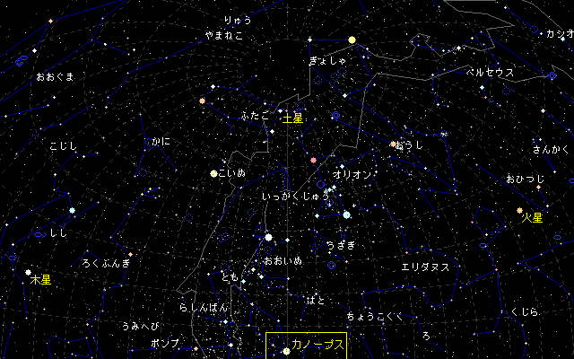 | 日本全国急に寒くなってきましたが、皆様お変わりはありませんでしょうか。寒ければ寒いほど冬の一等星たちは輝きを増します。カノープスをご存知でしょうか。おおいぬ座のシリウスが南中した頃に、南の地平線ぎりぎりに見える明るい星です。シリウスの次に明るい恒星です。この星は南日本しか見ることができません。また地平線ぎりぎりのため、光の屈折により赤く見えます。この星は中国では、南極老人星、老人星とも呼ばれ、一目でも見ると長生きができると言い伝えられています。 日の入り後には西の空に輝く金星、大接近から半年近く経過しだいぶ暗くなった火星、冬の星座たちの中に見られる土星、春の星座のなかの巨光、木星、本当に星の美しい時期です。 金星 カノープス ![]()