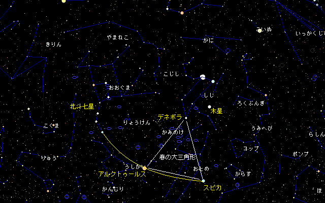 | 京都では、穏やかな日も出てきて、コートが要らなくなってきました。梅の花が美しく春が来ているのを感じます。 お星様の方は、春になると一等星が多い冬の星座が西に傾き始め、明るい星が減り少し寂しくなります。春にも有名な星があるので、お星様とコンピュータで覚えてください。まず春の有名な星の一つは、うしかい座のアルクトゥールスです。この星は、北斗七星の柄杓の柄のカーブを延長したところに見つかる明るい星です。更にこのカーブを延長するとおとめ座のスピカが見つかります。東の空に青白くポツリ輝く星です。以上のカーブを「春の大曲線」と呼びます。 後、少し暗い星なのですが、しし座のデネボラが春の星の仲間に入ります。この星と、アルクトゥールス、スピカで大きな三角形をなします。これを春の大三角形と呼びます。