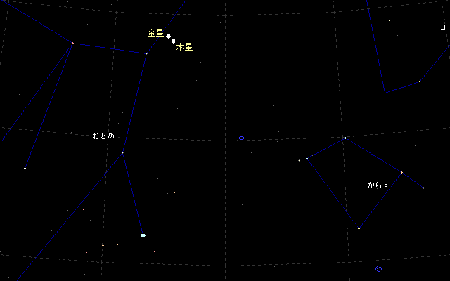 明け方の東のそらで、金星と木星が接近しています。11月5日には36′(満月一つ分くらい)まで接近します。どちらも大変明るい星なので見物です。