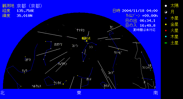 極大予想時刻は11月17日17時(日本では昼間)です。しかしあきらめずに前後の朝方11月17日2〜4時、11月18日2〜4時には観測しましょう。