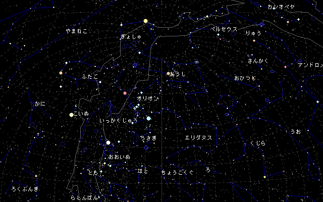 2005年明けましておめでとうございます。こちらで地域別の初日の出時刻を調べることが出来ます。しかし今年は天気が悪そうですね。この原稿を大晦日に書いていますが、現在京都でもかなりの雪が降っています。 寒い季節は本当に星が綺麗に瞬いています。南の空の多くの1等星は、都会でもその美しさがわかります。ふたご座の近くには土星が加わり、更に賑やかさを増しています。冬の間に、このお星様とコンピュータや、お星様iで星の名前を覚えてくださいね。冬の大三角形から覚えるのが良いと思います。 南