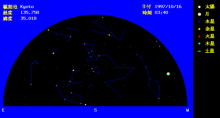 10月 6日 日没後 月、火星、金星の接近 10月16日 未明 木星が月に隠される 10月27日 日没後 火星、金星が最接近 |
