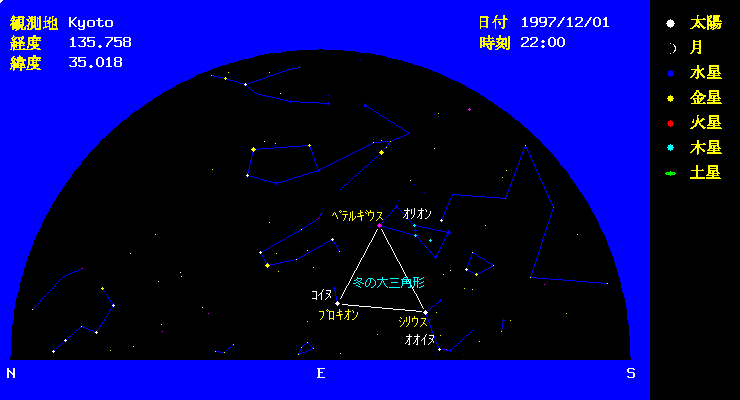 | 12月になり寒くなってくると、空気が澄み切ってくるため、お星様がだんだん奇麗になってきます。 また、冬は南の方向に明るい星座が多く、都会でもある程度は見えます。冬の星座の定番であるオリオンの ペテルギウス、こいぬ座のプロキオン、おおいぬ座のシリウスを覚えましょう。この3つの一等星の 三角形が東から昇ってきます。配置は下の図の通りです。 | |