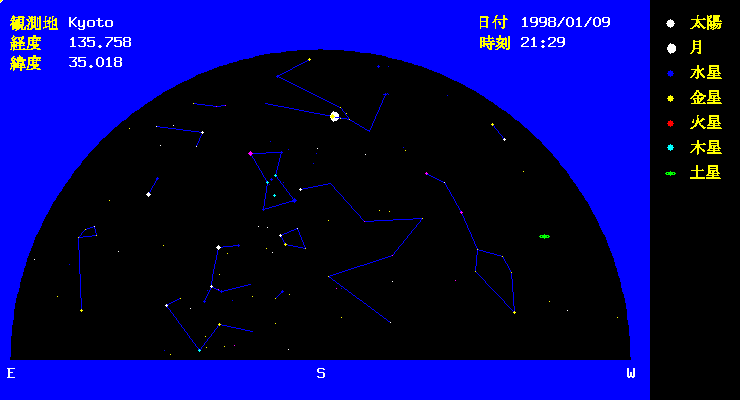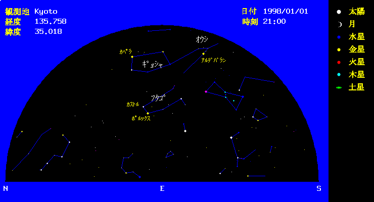 | 12月から1月初旬まで、宵の明星として西の空に明るく光っていた金星は1月後半から 明けの明星となります。 冬は南の方向に明るい星座が多く、都会でもある程度は見えます。12月の星空で説明した以外にも 東から南の空の天頂には明るい星がたくさんあります。天頂付近にはぎょしゃ座あり、五角形がはっきりわかると 思います。そのうち一番明るい星がカペラです。東に下がった所に二つ星が並んでいます。ふたご座です。明るいほうが お兄さんのポルックス、ちょっと暗いほうが弟のカストルです。南には、おうし座のアルデバランが見えます。 この星は1月9日に月に隠されます。月が明るいので観測には双眼鏡を用意しましょう。 | |