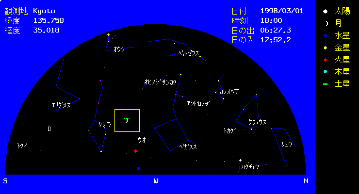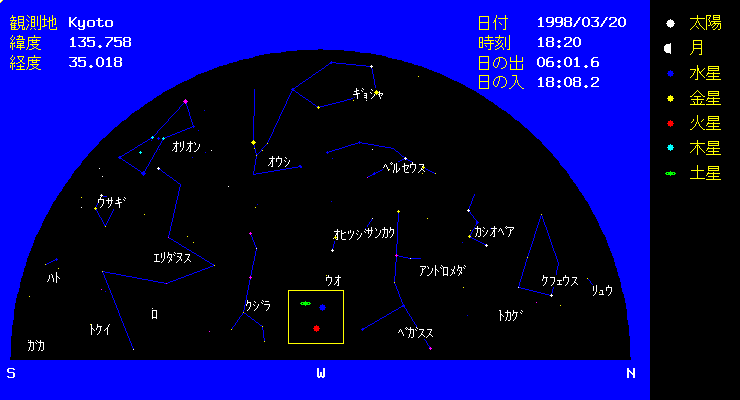| 3月1日 日没後、三日月と土星が接近 3月20日 日没後、土星、火星、水星が接近 |