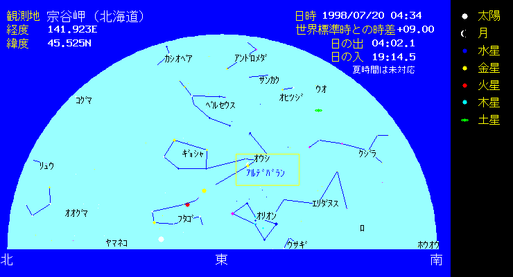 | 7月20日は明け方、北海道北部でアルデバランの接食が見られます。北海道では4時43分では太陽が昇っており、観測は 難しいと思います。それより南の地域ではアルデバランは月に隠されます。日の出前には、黄道に金星、火星が並んでおり、面白い写真が撮れそうです。 |