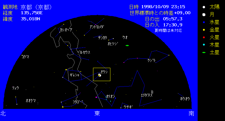 | 今年は台風の多い年です。台風の被害のニュースを見ていると痛ましいものがあります。 雨や曇りの日が多く、なかなかお星様も見えないですね。秋の星座は、明るいものが少ないのですが 今年は、木星と、土星が大変明るく輝いています。南の空に大変明るく輝いているのが 木星です。双眼鏡をお持ちの方は双眼鏡で観測してみましょう。小さな星を4個連れているのが わかります。これが木星のガリレオ衛星です。夜も遅くなってくると、東の空から スバルが昇りはじめます。正式名称はプレアデス星団です。目の悪い人は青白い小さな薄い雲のようで 目のいい人は6個以上の星がみえるでしょう。双眼鏡で見ると、自動車のスバルのマークは この星団がデザインされていることがわかります。 それと、今年の中秋の名月は10月5日です。 |