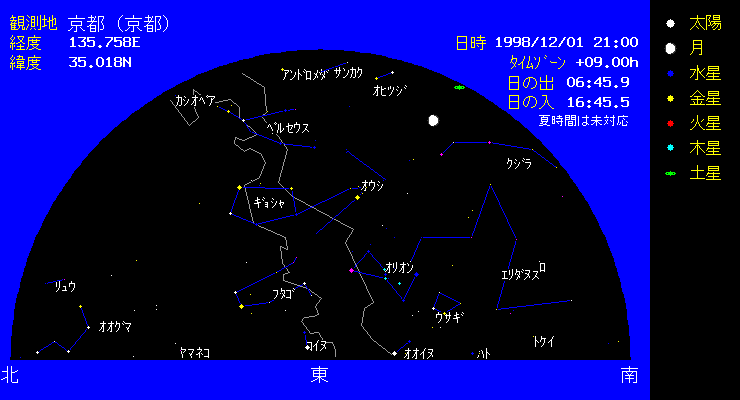 | 12月にもなると、冬の星座が勢ぞろいします。おなじみのオリオン座、頭の上には5角形のぎょしゃ座、