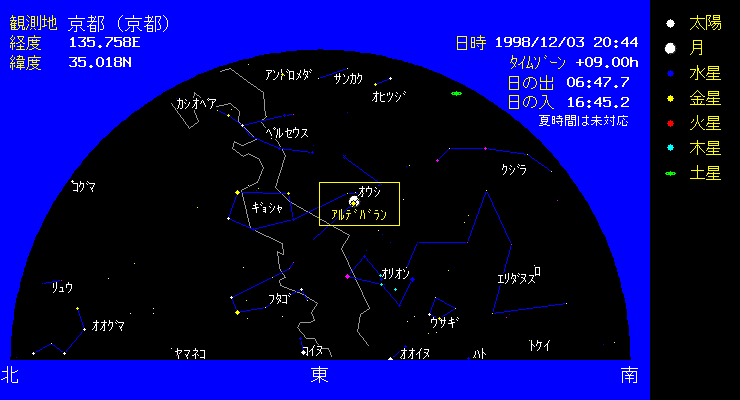 | 12月3日の20時44分頃(京都)20時51分(東京)におうし座のアルデバラン0.8等星が満月に隠されます。 アルデバランは1等星ですが、月が明るいので観測には双眼鏡が必要です。 |