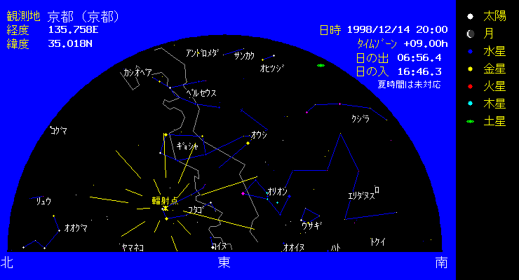 | ふたご座流星群がこの日に極大となります。予想される流れ星の数は1時間あたり40個くらいです。極大予想時刻は 昼間ですが、13日〜14日、14〜15日のふたご座が昇る始める20時頃から東の空を観測しましょう。 この日の月の出は2時過ぎであり、観測条件は最適です。 |