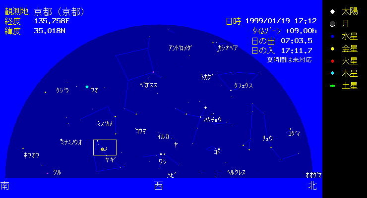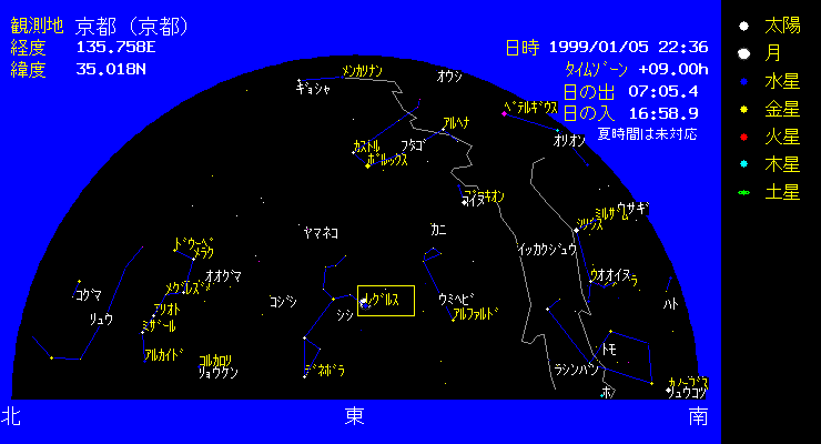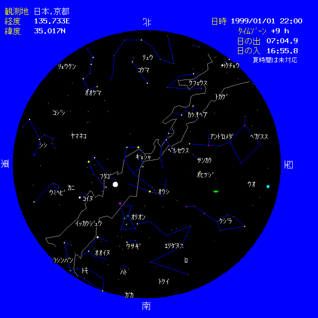 | お正月です。初日の出は見に行かれますでしょうか。日の出時刻については、ここをご参照ください。 冬になると、空気が澄んでいますし、南の空には一等星が勢揃いします。このお星様とコンピュータで 星の名前を覚えていただけると嬉しいです。 |
