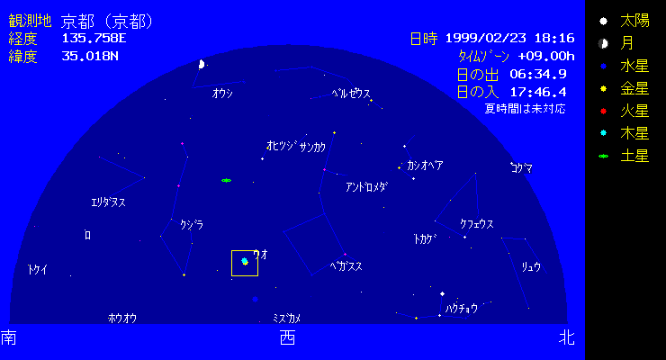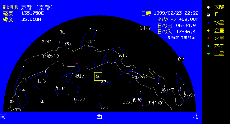| 大変寒い日が続きますが、冬晴れであればこんな時ほど星の美しい日はありませんね。 冬は南の空に一等星が勢揃いするので、都会にお住まいの方も会社の帰りには多くの 星を見ることができます。お星様とコンピュータで星の名前を覚えましょう。金星が宵の明星となって、西の空に輝き始めました。 また、2月16日にオーストラリア近辺にいらっしゃる方は、日食が観測できます。 残念ながら日本では部分日食も見られません。 |