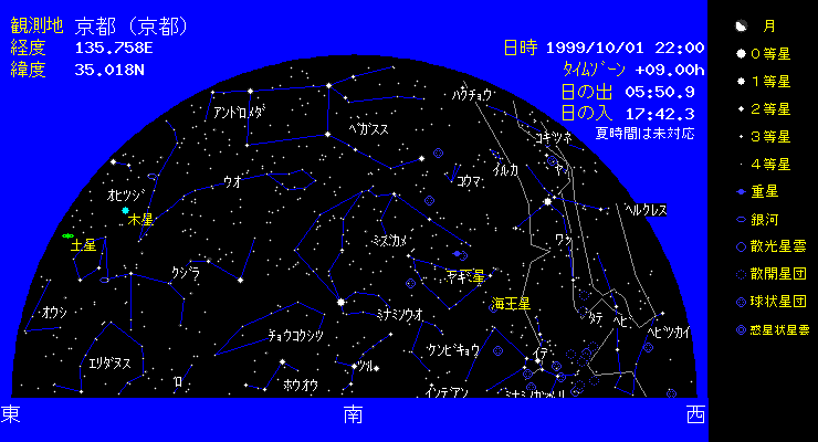 | だんだん秋を思わせるように、なってきましたね。天頂には秋の星座であるペガススの四角形が見られるようになってきました。秋は明るい星が少なく,少し寂しい気もするのですが,今年は