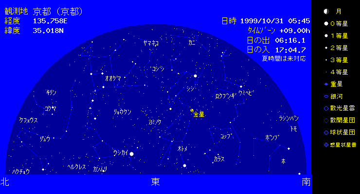 明けの明星として金星が大変明るく輝いています。10月31日には西方最大離角となり日の出時の光度は40°を越えます。明るさは−4.4等星です。