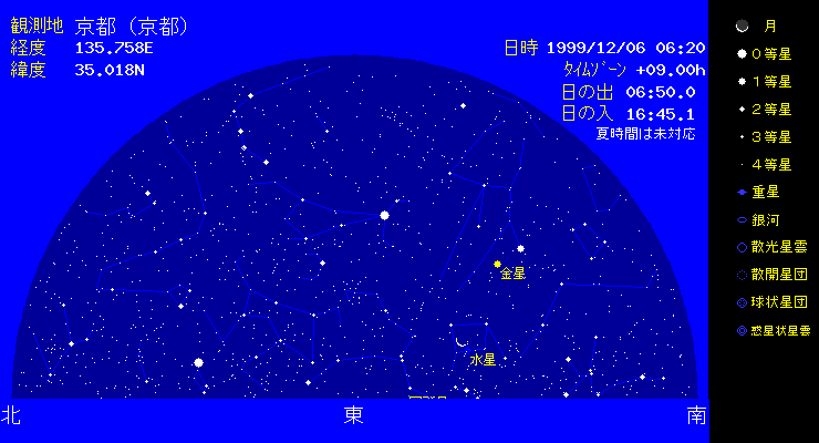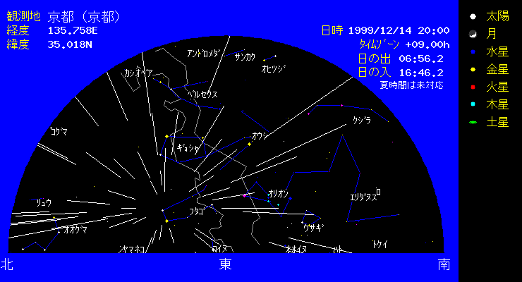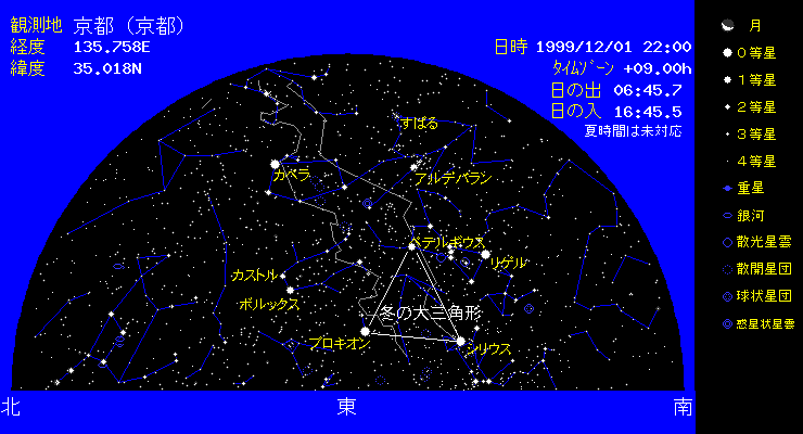 | 11月のしし座流星群の極大日は,日本のほとんどの地域が曇ってしまい残念な結果でした。ヨーロッパでは,世界時18日2時頃をピークとして、1時間あたり数1000個の流星雨となりました。今回は予想通りの時刻に流星雨となりました。 12月にはふたご座流星群が見られます。この流星群は、安定してある程度の出現を見せますので 観測してみましょう。極大は12月14日20時頃になります。 寒くなってきましたが,本当に星のきれいな季節となってきました。東の空にはオリオンの雄姿が見られ,その右下には全天で2番目に明るい恒星であるシリウスが輝いています。(全天で一番明るい恒星は太陽です。)左下には,こいぬ座のプロキオンが輝いており,オリオン座のペテルギウス,おおいぬ座のシリウスの1等星で作る三角形を冬の第三角形と呼びます。またオリオンの上の方の天頂近くには, 青白いすばるが見られます。目のいい人は6個の星に分かれて見えるはずです。双眼鏡で見れば もっとたくさんの星に分かれて見えます。 |