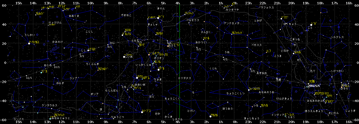 黄道12星座は、太陽の通り道にある12の星座です。「私は、おとめ座生まれ」などと誕生日の占いに使われます。その月に地球から見て太陽の後ろ側になる星座になります。したがってその月には対応する星座を見ることはできません。