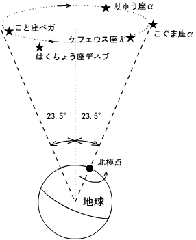 - しかしこの星も長い間には位置を変えてしまいます。これは、地球に歳差と呼ばれる、コマの首振り運動のような動きがあるからです。これは、約25800年を周期に、地球の自転軸から23.5°傾いたところを中心に回転する動きです。